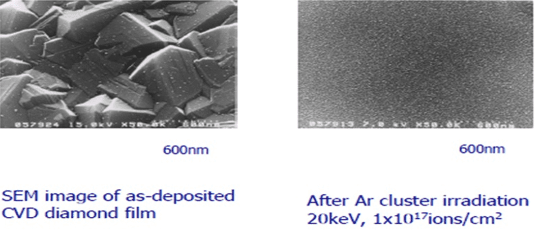 照射前と比較して、CVD ダイヤモンド表面の粗さを劇的に改善し、超平坦化 を実現した事例。